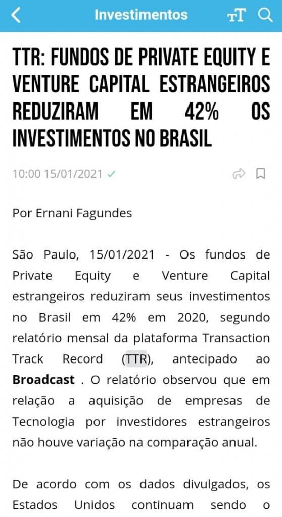 Os fundos de Private Equity e Venture Capital estrangeiros reduziram seus investimentos no Brasil em 42% em 2020, segundo relatório mensal da plataforma Transaction Track Record (TTR), antecipado ao Broadcast . O relatório observou que em relação a aquisição de empresas de Tecnologia por investidores estrangeiros não houve variação na comparação anual.