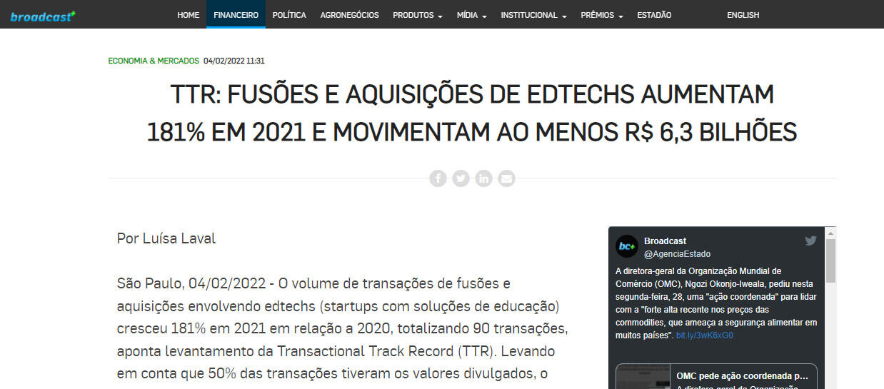 O volume de transações de fusões e aquisições envolvendo edtechs (startups com soluções de educação) cresceu 181% em 2021 em relação a 2020, totalizando 90 transações, aponta levantamento da Transactional Track Record (TTR). Levando em conta que 50% das transações tiveram os valores divulgados, o segmento mobilizou um capital de R$ 6,3 bilhões.