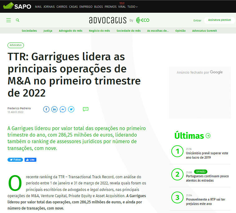 Orecente ranking da TTR – Transactional Track Record, com análise do período entre 1 de janeiro e 31 de março de 2022, revela quais foram os principais escritórios de advogados e legal advisors, nas principais operações de M&A, Venture Capital, Private Equity e Asset Acquisition. A Garrigues liderou por valor total das operações, com 286,25 milhões de euros, e ainda por número de transações, com nove.