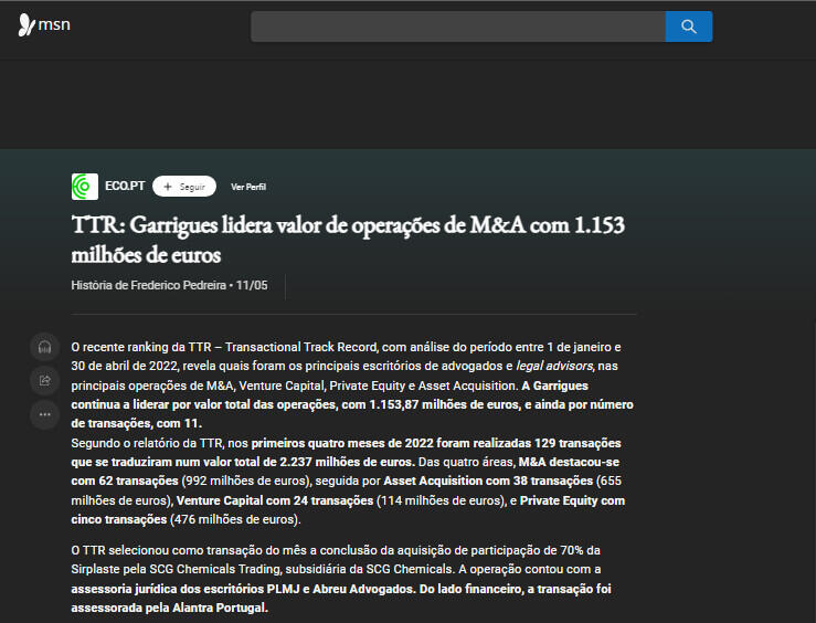 O TTR selecionou como transação do mês a conclusão da aquisição de participação de 70% da Sirplaste pela SCG Chemicals Trading, subsidiária da SCG Chemicals. A operação contou com a assessoria jurídica dos escritórios PLMJ e Abreu Advogados. Do lado financeiro, a transação foi assessorada pela Alantra Portugal.