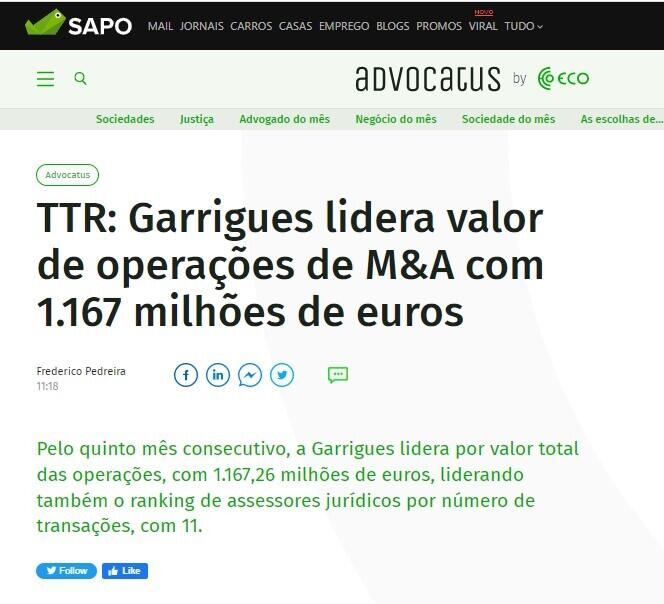 TTR: Garrigues lidera valor de operações de M&A com 1.167 milhões de euros