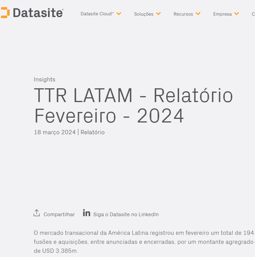 O mercado transacional da América Latina registrou em fevereiro um total de 194 fusões e aquisições, entre anunciadas e encerradas, por um montante agregrado de USD 3.385m.