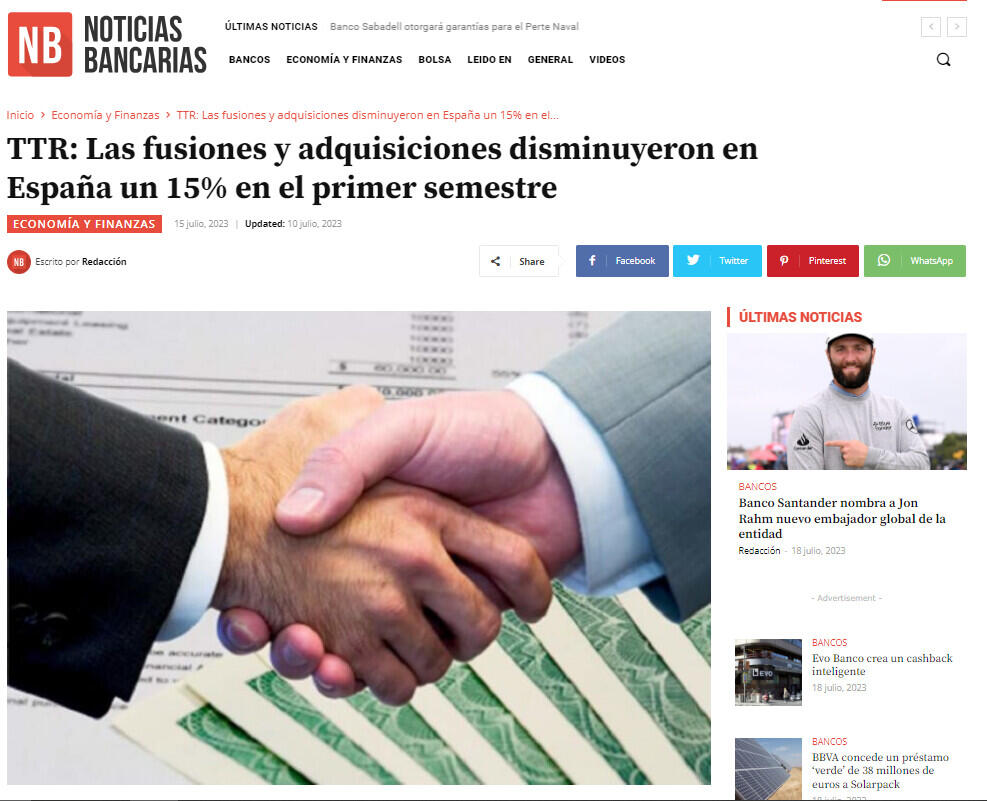 TTR: Las fusiones y adquisiciones disminuyeron en Espaņa un 15% en el primer semestre