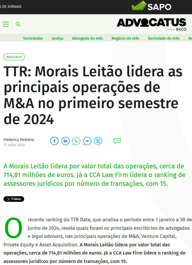 O recente ranking do TTR Data, que analisa o período entre 1 janeiro a 30 de junho de 2024, revela quais foram os principais escritórios de advogados e legal advisors, nas principais operações de M&A, Venture Capital, Private Equity e Asset Acquisition. A Morais Leitão lidera por valor total das operações, cerca de 714,81 milhões de euros. Já a CCA Law Firm lidera o ranking de assessores jurídicos por número de transações, com 15.