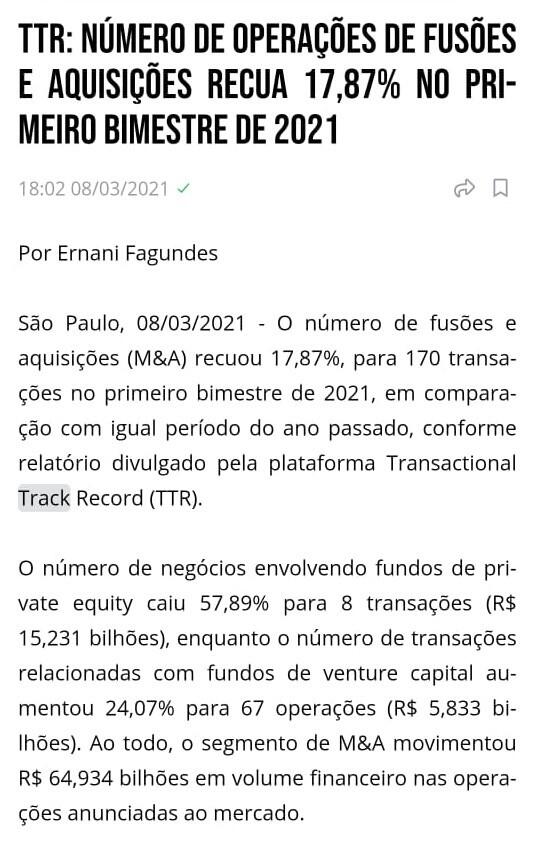 TTR: Número de operações de fusões e aquisições recua 17,87% no primeiro bimestre de 2021