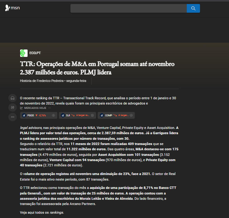 TTR: Operações de M&A em Portugal somam até novembro 2.387 milhões de euros. PLMJ lidera