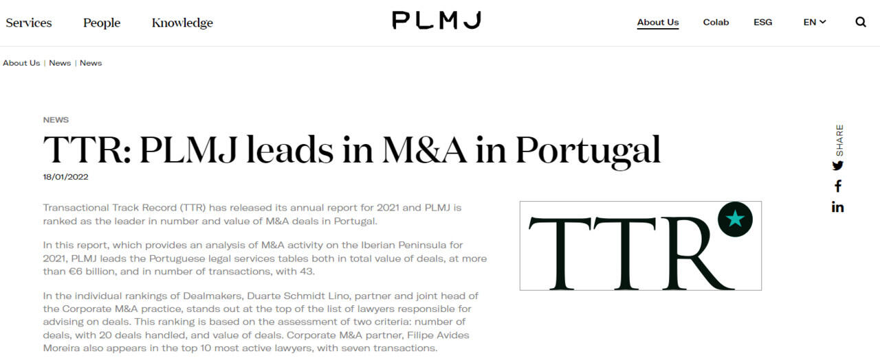 Transactional Track Record (TTR) has released its annual report for 2021 and PLMJ is ranked as the leader in number and value of M&A deals in Portugal.