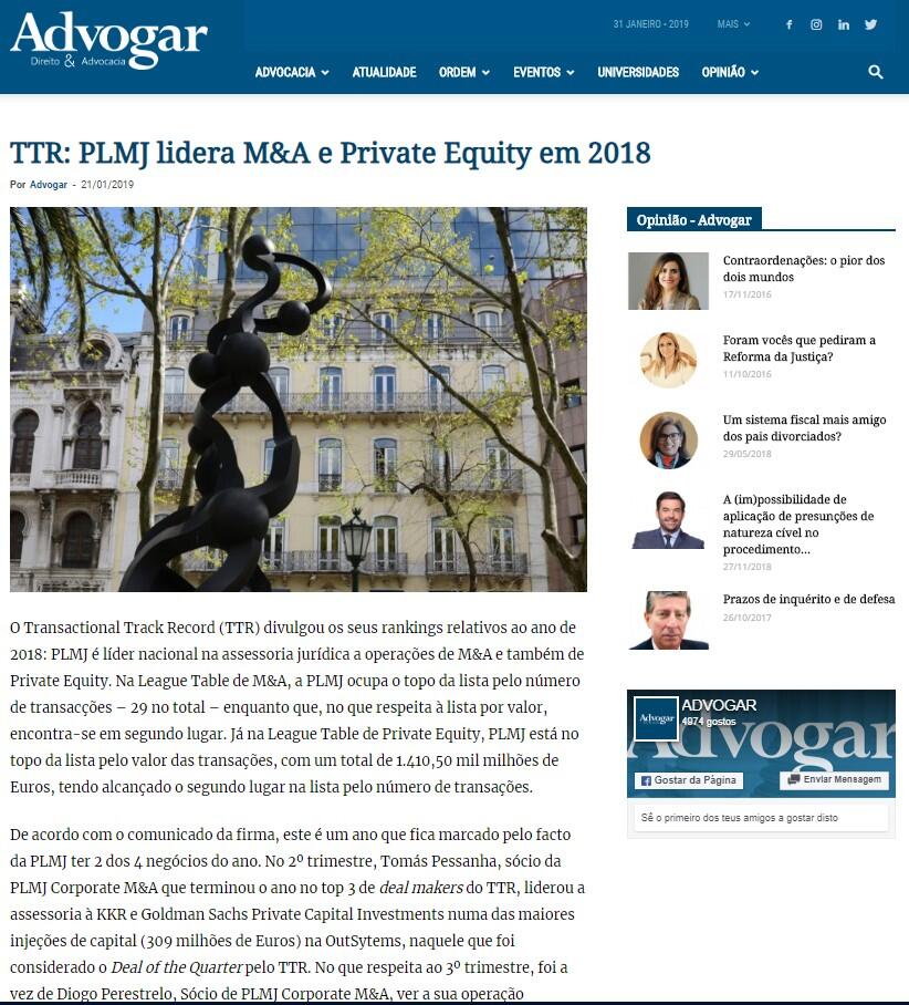O Transactional Track Record (TTR) divulgou os seus rankings relativos ao ano de 2018: PLMJ é líder nacional na assessoria jurídica a operações de M&A e também de Private Equity. Na League Table de M&A, a PLMJ ocupa o topo da lista pelo número de transacções – 29 no total – enquanto que, no que respeita à lista por valor, encontra-se em segundo lugar. Já na League Table de Private Equity, PLMJ está no topo da lista pelo valor das transações, com um total de 1.410,50 mil milhões de Euros, tendo alcançado o segundo lugar na lista pelo número de transações.