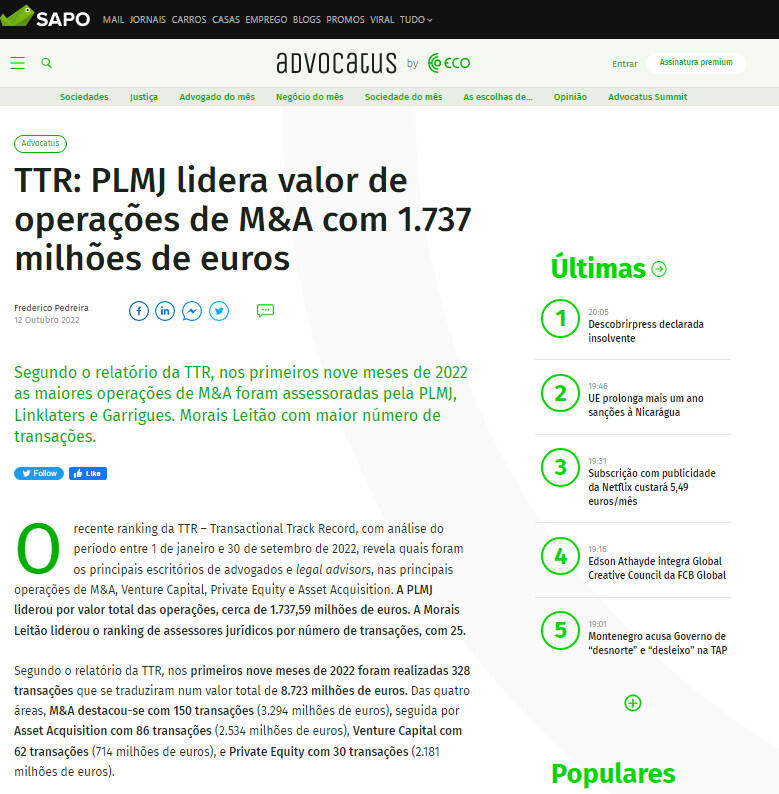 O recente ranking da TTR – Transactional Track Record, com análise do período entre 1 de janeiro e 30 de setembro de 2022, revela quais foram os principais escritórios de advogados e legal advisors, nas principais operações de M&A, Venture Capital, Private Equity e Asset Acquisition. A PLMJ liderou por valor total das operações, cerca de 1.737,59 milhões de euros. A Morais Leitão liderou o ranking de assessores jurídicos por número de transações, com 25.