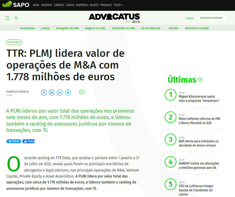 TTR: PLMJ lidera valor de operações de M&A com 1.778 milhões de euros