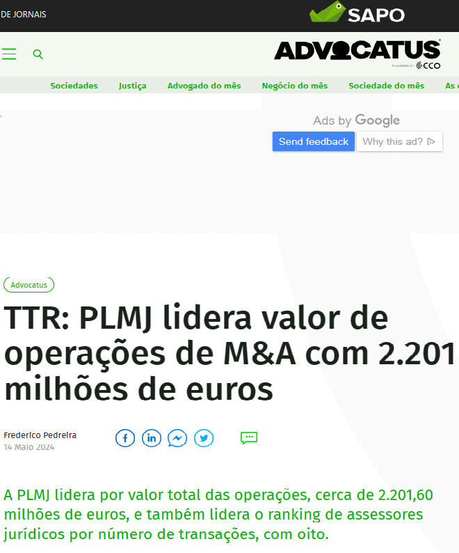 TTR: PLMJ lidera valor de operações de M&A com 2.201 milhões de euros