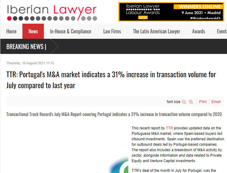 Transactional Track Record's July M&A Report covering Portugal indicates a 31% increase in transaction volume compared to 2020