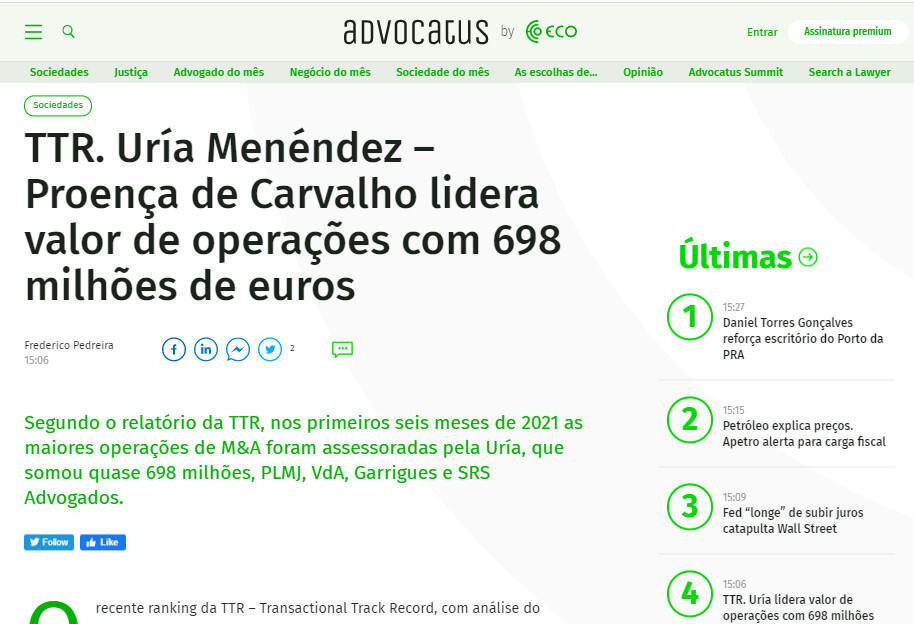O recente ranking da TTR – Transactional Track Record, com análise do período entre 1 de janeiro e 31 de junho de 2021, revela quais foram os principais escritórios de advogados e legal advisors, nas principais operações de M&A, Venture Capital, Private Equity e Asset Acquisition. A Uría Menéndez-Proença de Carvalho liderou por valor total das operações, cerca de 697,99 milhões de euros. A SRS Advogados liderou o ranking de assessores jurídicos por número de transações, com doze.