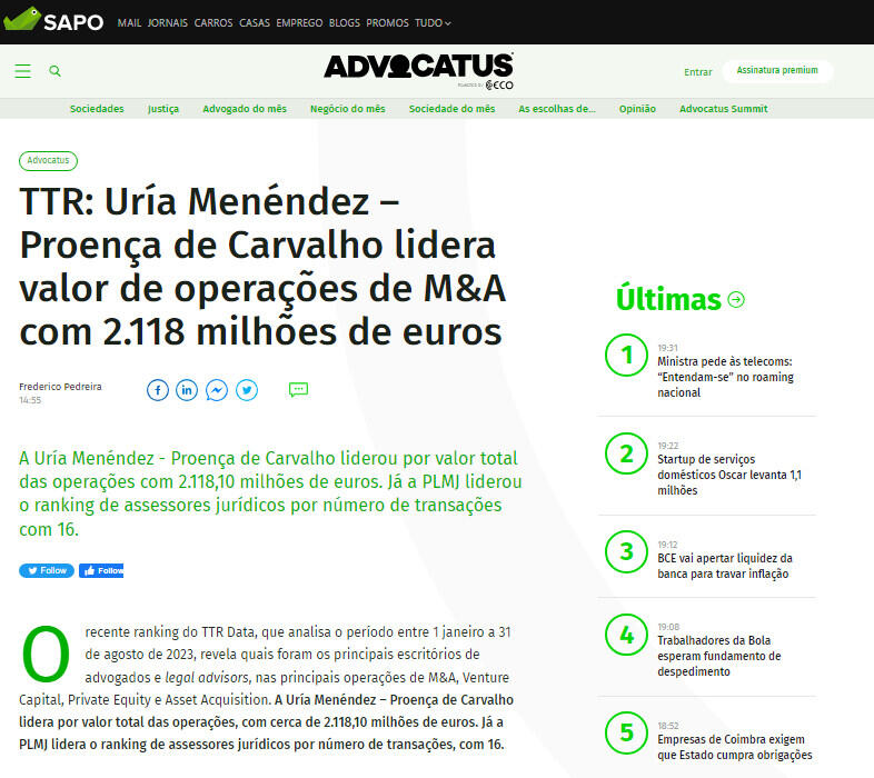 TTR: Uría Menéndez – Proença de Carvalho lidera valor de operações de M&A com 2.118 milhões de euros