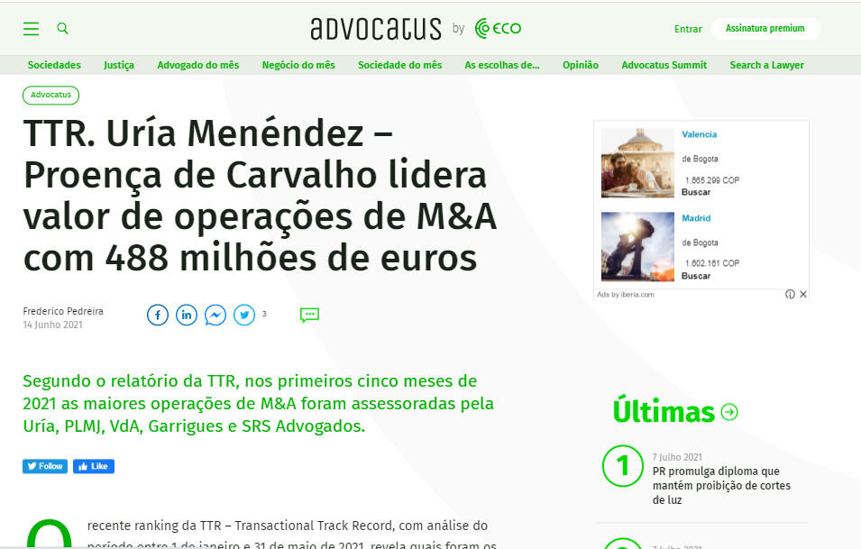 O recente ranking da TTR – Transactional Track Record, com análise do período entre 1 de janeiro e 31 de maio de 2021, revela quais foram os principais escritórios de advogados e legal advisors, nas principais operações de M&A, Venture Capital, Private Equity e Asset Acquisition. A Uría Menéndez-Proença de Carvalho liderou por valor total das operações, cerca de 489 milhões de euros. A SRS Advogados liderou o ranking de assessores jurídicos por número de transações, com nove.