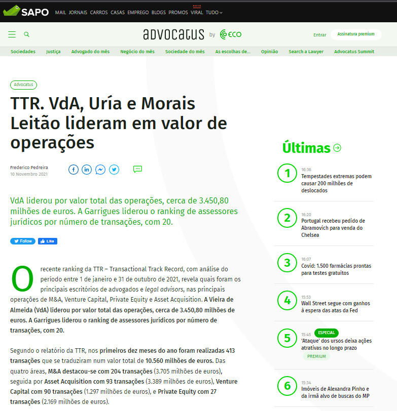 Orecente ranking da TTR – Transactional Track Record, com análise do período entre 1 de janeiro e 31 de outubro de 2021, revela quais foram os principais escritórios de advogados e legal advisors, nas principais operações de M&A, Venture Capital, Private Equity e Asset Acquisition. A Vieira de Almeida (VdA) liderou por valor total das operações, cerca de 3.450,80 milhões de euros. A Garrigues liderou o ranking de assessores jurídicos por número de transações, com 20.