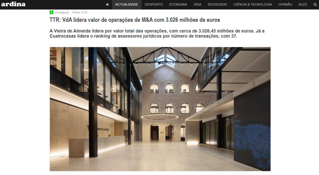 TTR: VdA lidera valor de operações de M&A com 3.026 milhões de euros