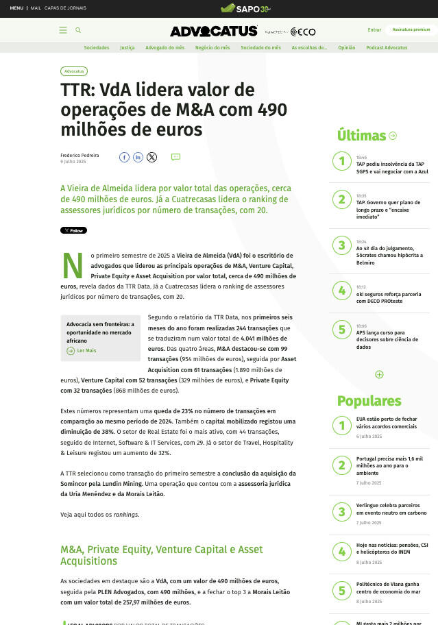 TTR: VdA lidera valor de operações de M&A com 490 milhões de euros
