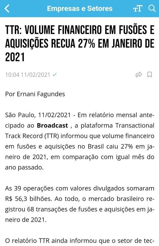 Em relatório mensal antecipado ao  Broadcast , a plataforma Transactional Track Record (TTR) informou que volume financeiro em fusões e aquisições no Brasil caiu 27% em janeiro de 2021, em comparação com igual mês do ano passado.