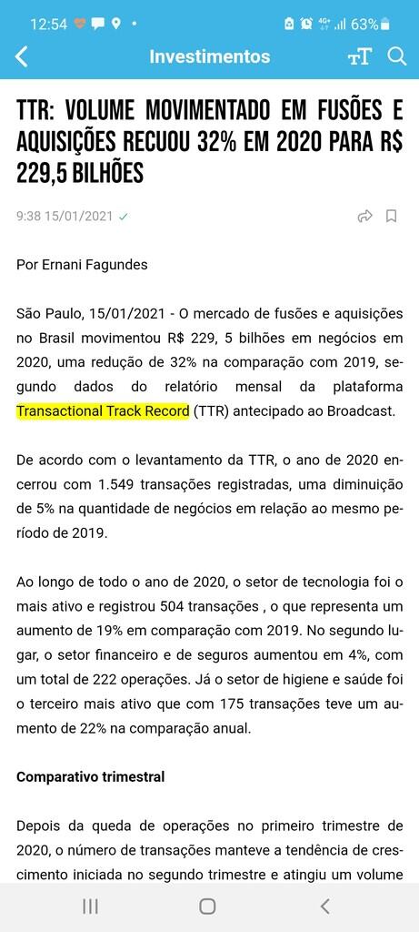 O mercado de fusões e aquisições no Brasil movimentou R$ 229, 5 bilhões em negócios em 2020, uma redução de 32% na comparação com 2019, segundo dados do relatório mensal da plataforma Transactional Track Record (TTR) antecipado ao Broadcast.