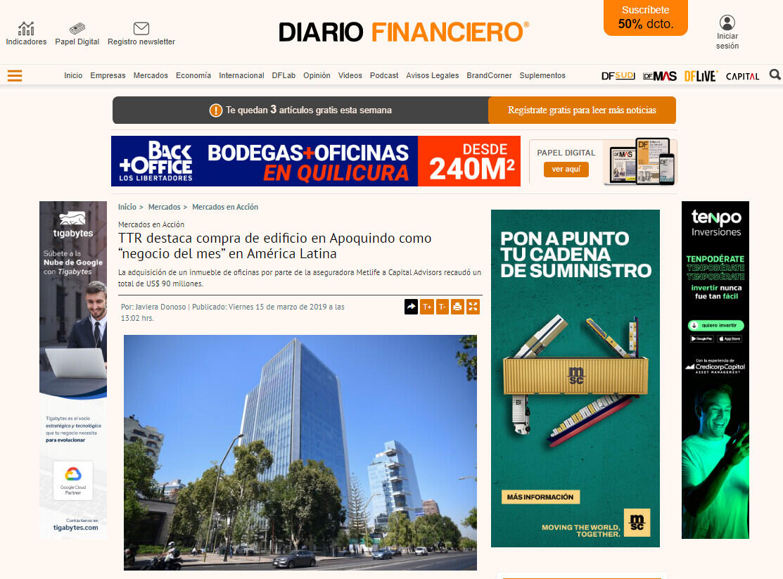 La adquisición de un edificio de oficinas en la calle Apoquindo, cerca del metro Tobalaba, por parte de MetLife Chile Seguros de Vida, recaudó un total de US$ 90 millones. El vendedor en la operación fue Capital Advisors Equity Investments.