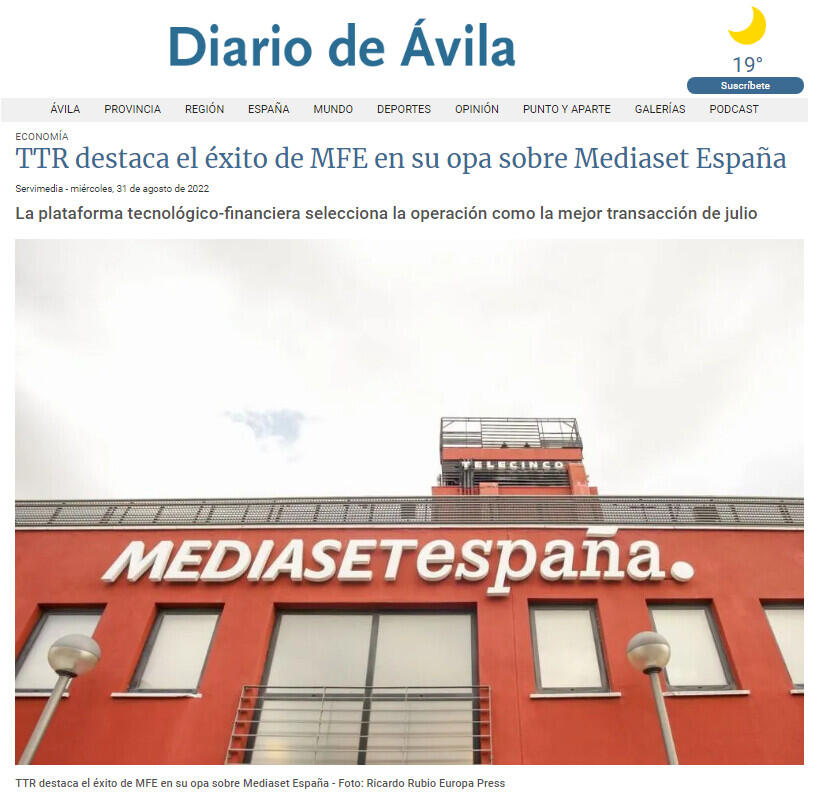 El éxito alcanzado por Media For Europe (MFE) en la oferta pública de adquisición lanzada por el 44,31% que no controlaba de Mediaset España ha sido seleccionado como la transacción del mes de julio por la plataforma tecnológico-financiera Transactional Track Record (TTR).