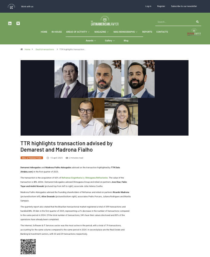 Demarest Advogados and Madrona Fialho Advogados advised on the transaction highlighted by TTR Data (ttrdata.com) in the first quarter of 2025.