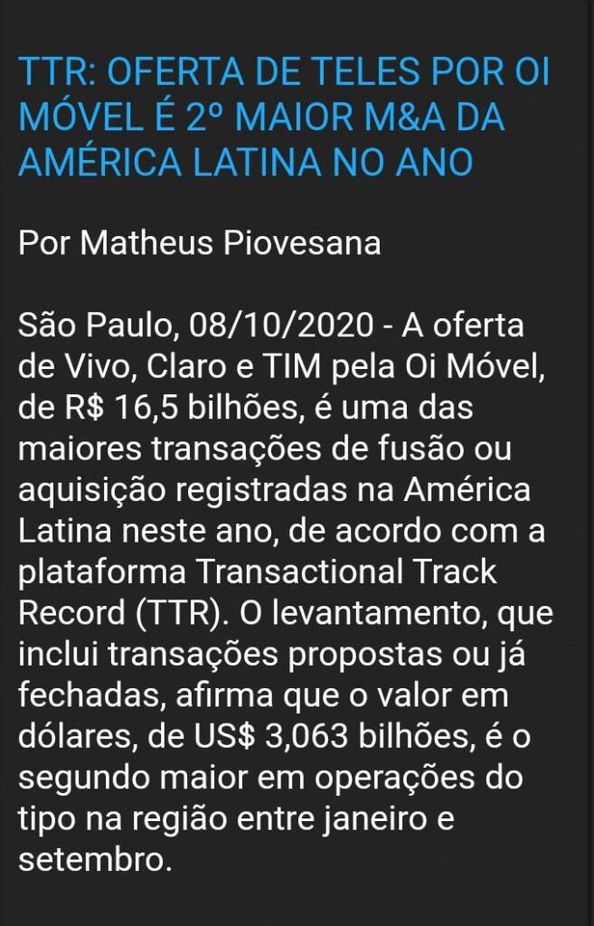 A oferta de Vivo, Claro e TIM pela Oi Móvel, de R$ 16,5 bilhões, é uma das maiores transações de fusão ou aquisição registradas na América Latina neste ano, de acordo com a plataforma Transactional Track Record (TTR). O levantamento, que inclui transações propostas ou já fechadas, afirma que o valor em dólares, de US$ 3,063 bilhões, é o segundo maior em operações do tipo na região entre janeiro e setembro.