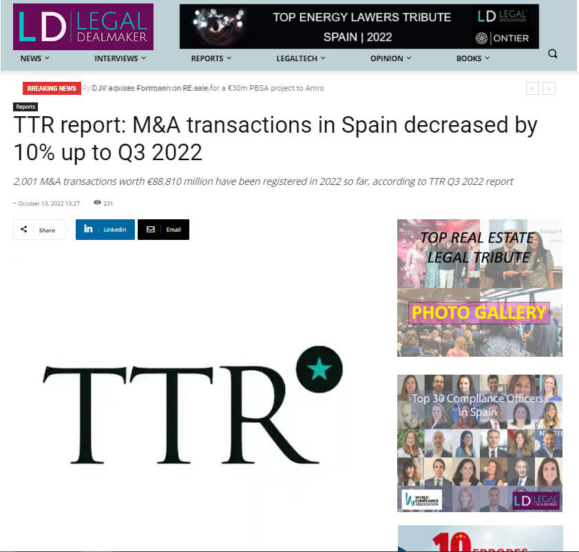 TTR report: M&A transactions in Spain decreased by 10% up to Q3 2022