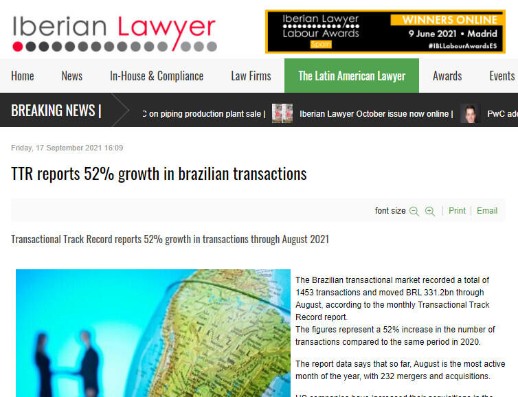 The Brazilian transactional market recorded a total of 1453 transactions and moved BRL 331.2bn through August, according to the monthly Transactional Track Record report.