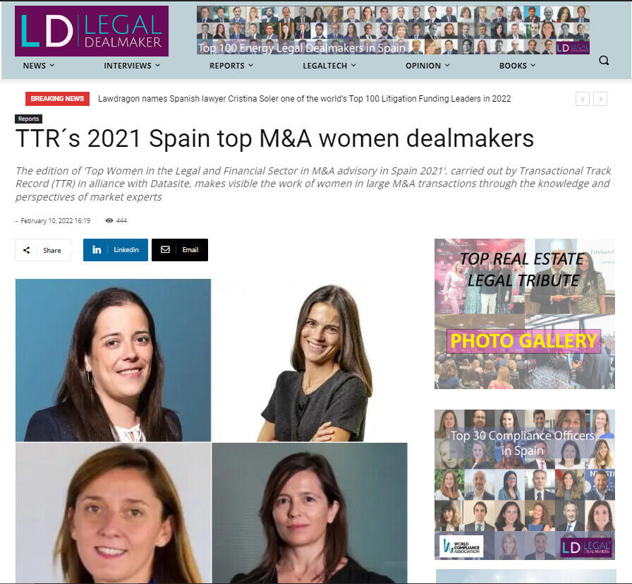 Taking into account the absence of legan and financial rankings of women's participation in the Spanish M&A market, TTR and Datasite have published the Top 10 female Legal and Financial dealmakers in the Spanish M&A market in 2021. The legal dealmakers ranking comprises both partners and counsel category as well as a Rising Stars category.
