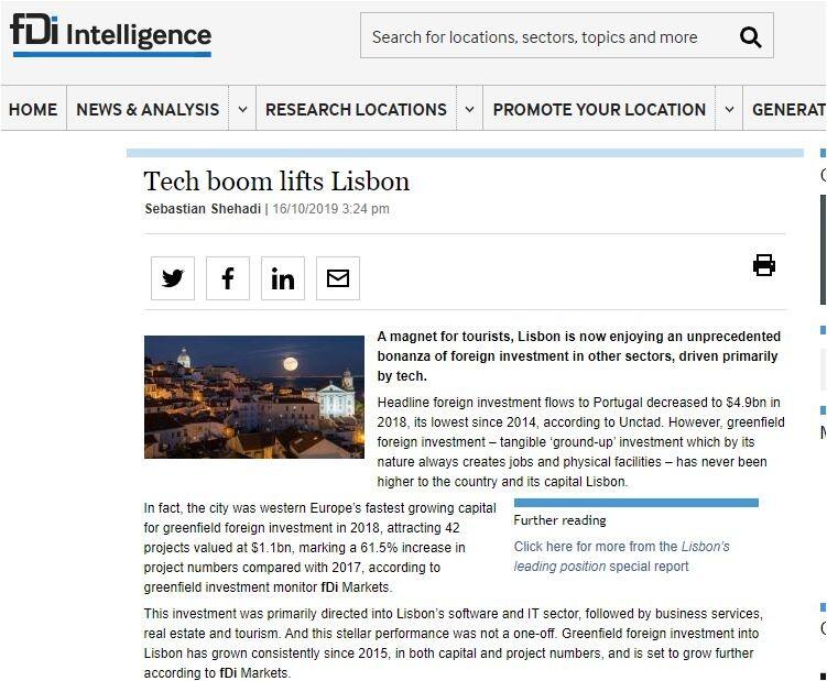 Headline foreign investment flows to Portugal decreased to $4.9bn in 2018, its lowest since 2014, according to Unctad. However, greenfield foreign investment – tangible ‘ground-up’ investment which by its nature always creates jobs and physical facilities – has never been higher to the country and its capital Lisbon.
