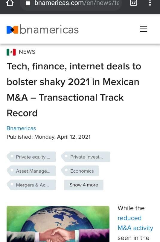 Tech, finance, internet deals to bolster shaky 2021 in Mexican M&A- Transactional Track Record