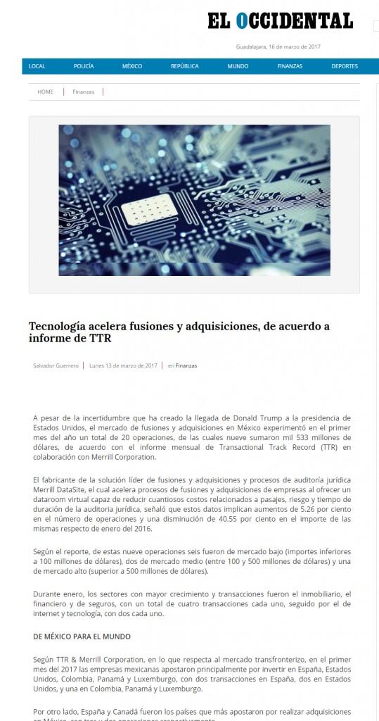 El fabricante de la solución líder de fusiones y adquisiciones y procesos de auditoría jurídica Merrill DataSite, el cual acelera procesos de fusiones y adquisiciones de empresas al ofrecer un dataroom virtual capaz de reducir cuantiosos costos relacionados a pasajes, riesgo y tiempo de duración de la auditoria jurídica, señaló que estos datos implican aumentos de 5.26 por ciento en el número de operaciones y una disminución de 40.55 por ciento en el importe de las mismas respecto de enero del 2016.