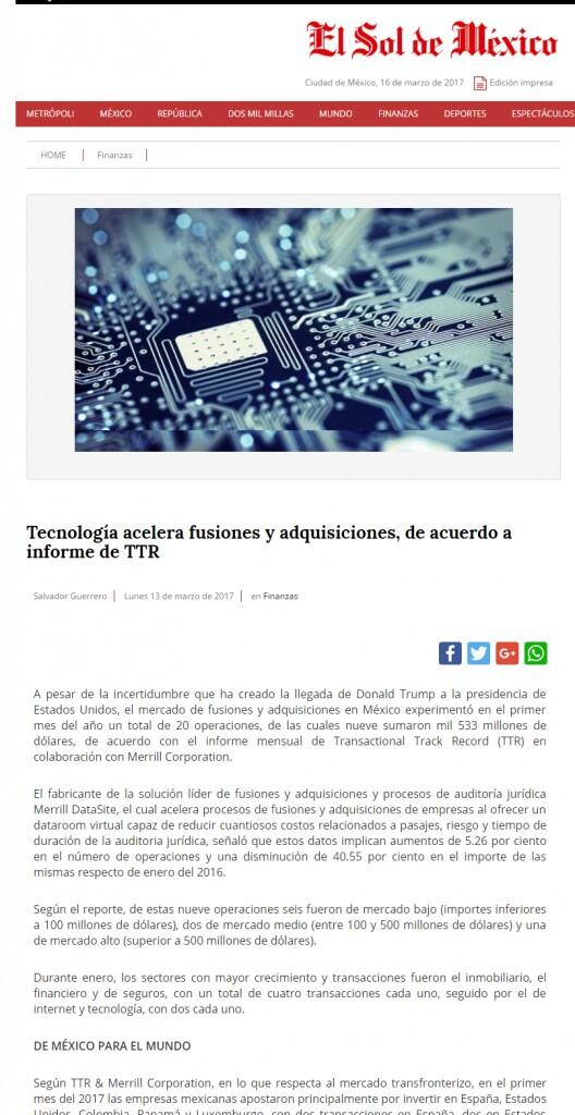 El fabricante de la solución líder de fusiones y adquisiciones y procesos de auditoría jurídica Merrill DataSite, el cual acelera procesos de fusiones y adquisiciones de empresas al ofrecer un dataroom virtual capaz de reducir cuantiosos costos relacionados a pasajes, riesgo y tiempo de duración de la auditoria jurídica, señaló que estos datos implican aumentos de 5.26 por ciento en el número de operaciones y una disminución de 40.55 por ciento en el importe de las mismas respecto de enero del 2016.