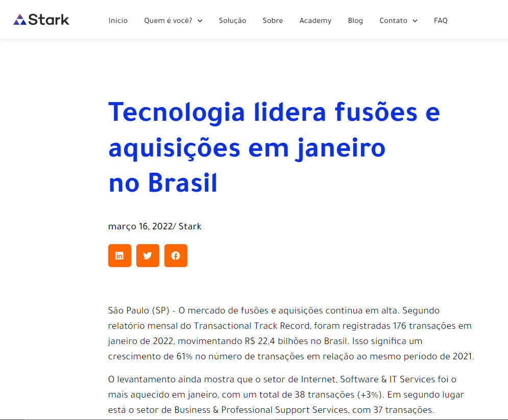 São Paulo (SP) – O mercado de fusões e aquisições continua em alta. Segundo relatório mensal do Transactional Track Record, foram registradas 176 transações em janeiro de 2022, movimentando R$ 22,4 bilhões no Brasil. Isso significa um crescimento de 61% no número de transações em relação ao mesmo período de 2021.