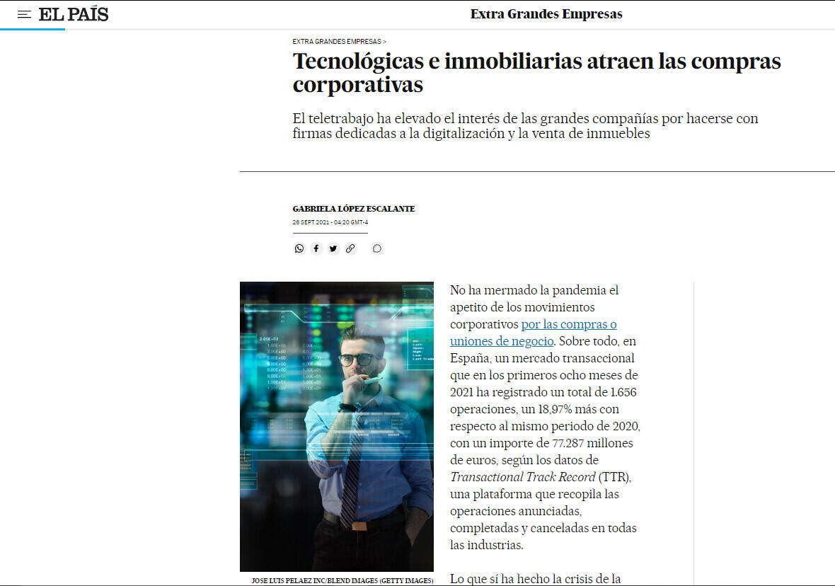 No ha mermado la pandemia el apetito de los movimientos corporativos por las compras o uniones de negocio. Sobre todo, en España, un mercado transaccional que en los primeros ocho meses de 2021 ha registrado un total de 1.656 operaciones, un 18,97% más con respecto al mismo periodo de 2020, con un importe de 77.287 millones de euros, según los datos de Transactional Track Record (TTR), una plataforma que recopila las operaciones anunciadas, completadas y canceladas en todas las industrias.