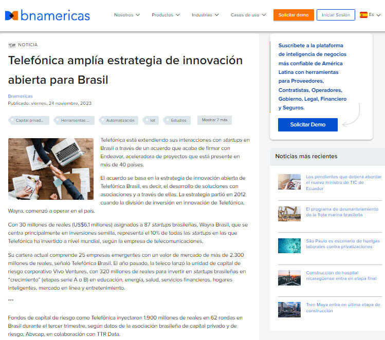 Su cartera actual comprende 25 empresas emergentes con un valor de mercado de más de 2.300 millones de reales, señaló Telefônica Brasil. El año pasado, la teleco lanzó la unidad de capital de riesgo corporativo Vivo Ventures, con 320 millones de reales para invertir en startups brasileñas en “crecimiento” (etapas serie A o B) en educación, energía, salud, servicios financieros, hogares inteligentes, mercado en línea y entretenimiento.