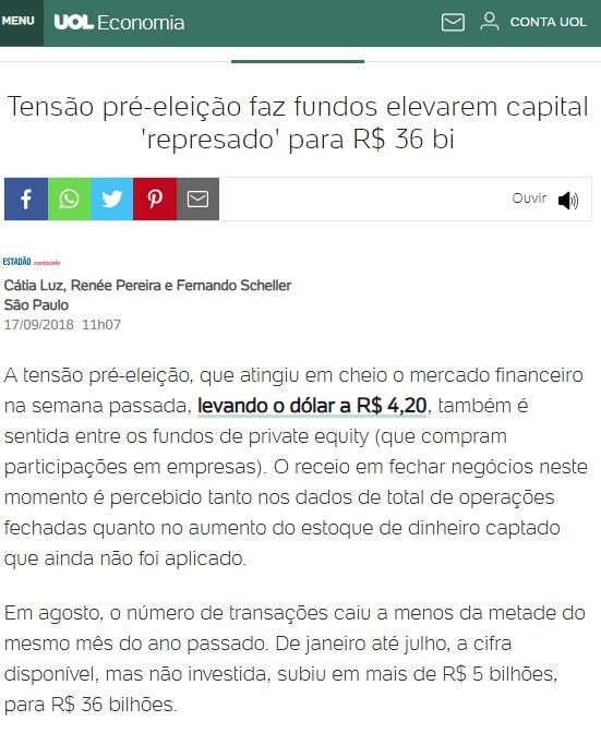 A tensão pré-eleição, que atingiu em cheio o mercado financeiro na semana passada, levando o dólar a R$ 4,20, também é sentida entre os fundos de private equity (que compram participações em empresas). O receio em fechar negócios neste momento é percebido tanto nos dados de total de operações fechadas quanto no aumento do estoque de dinheiro captado que ainda não foi aplicado.