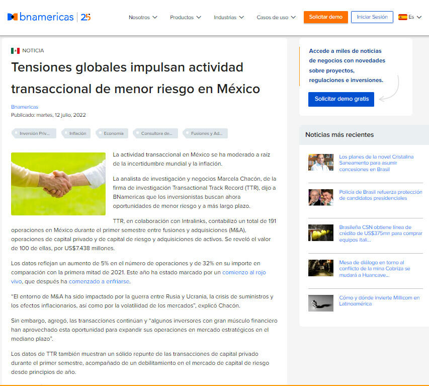 TTR, en colaboración con Intralinks, contabilizó un total de 191 operaciones en México durante el primer semestre entre fusiones y adquisiciones (M&A), operaciones de capital privado y de capital de riesgo y adquisiciones de activos. Se reveló el valor de 100 de ellas, por US$7.438 millones.