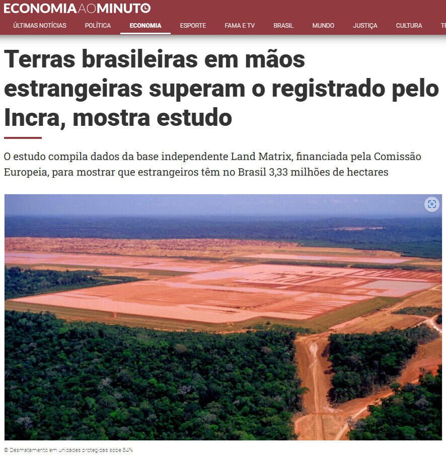 O estudo compila dados da base independente Land Matrix, financiada pela Comissão Europeia, para mostrar que estrangeiros têm no Brasil 3,33 milhões de hectares -cerca de 15% mais do registrado no Incra. A base do SNCR (Sistema Nacional de Cadastro Rural), disponibilizado pelo órgão federal, contabiliza 2,8 milhões de hectares de terras rurais em propriedade de estrangeiros.