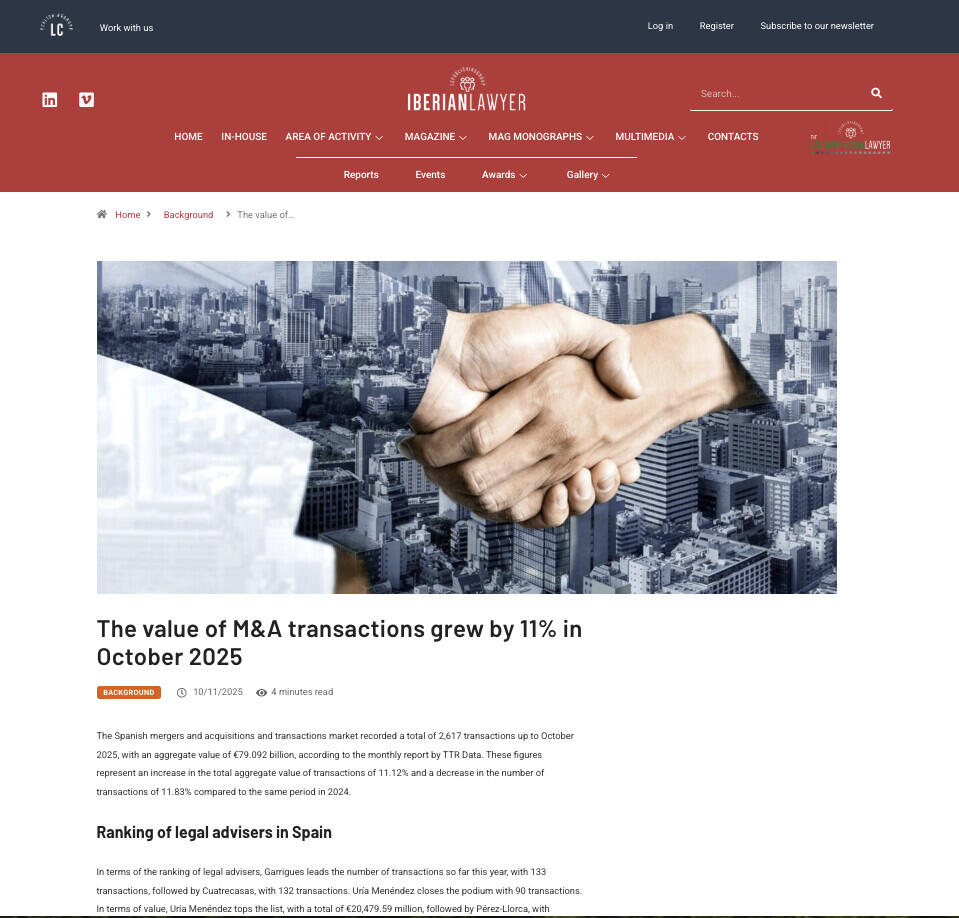 The Spanish mergers and acquisitions and transactions market recorded a total of 2,617 transactions up to October 2025, with an aggregate value of €79.092 billion, according to the monthly report by TTR Data. These figures represent an increase in the total aggregate value of transactions of 11.12% and a decrease in the number of transactions of 11.83% compared to the same period in 2024.