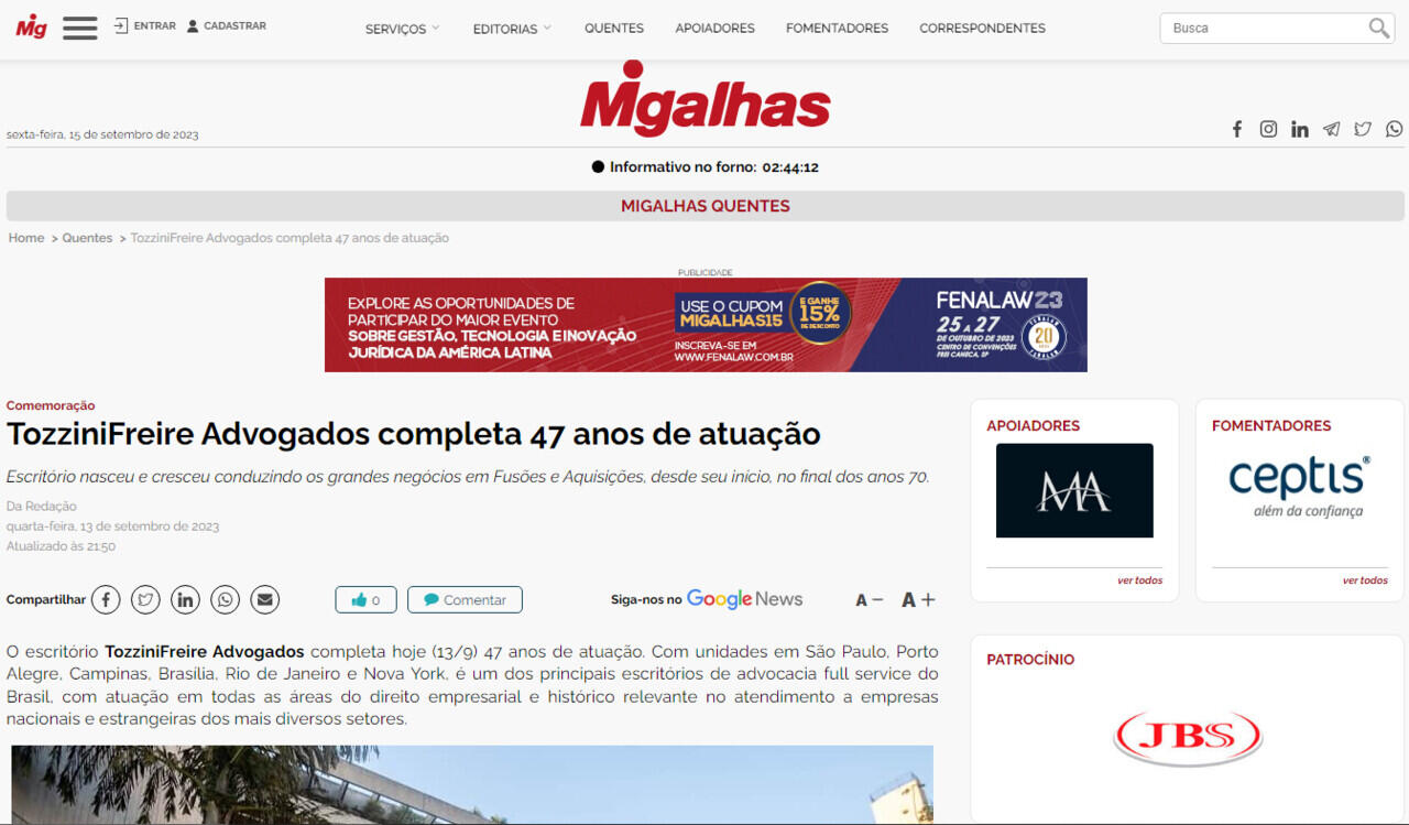 TozziniFreire Advogados completa 47 anos de atuação