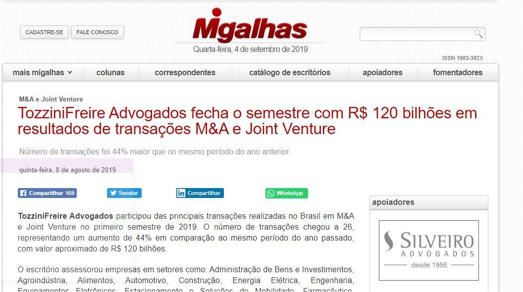 TozziniFreire Advogados participou das principais transações realizadas no Brasil em M&A e Joint Venture no primeiro semestre de 2019. O número de transações chegou a 26, representando um aumento de 44% em comparação ao mesmo período do ano passado, com valor aproximado de R$ 120 bilhões.