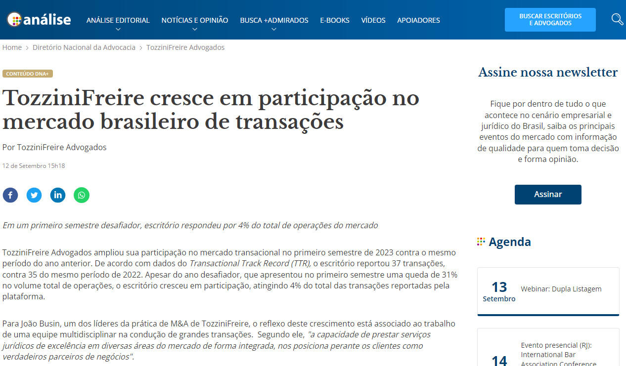 TozziniFreire Advogados ampliou sua participação no mercado transacional no primeiro semestre de 2023 contra o mesmo período do ano anterior. De acordo com dados do Transactional Track Record (TTR), o escritório reportou 37 transações, contra 35 do mesmo período de 2022. Apesar do ano desafiador, que apresentou no primeiro semestre uma queda de 31% no volume total de operações, o escritório cresceu em participação, atingindo 4% do total das transações reportadas pela plataforma.