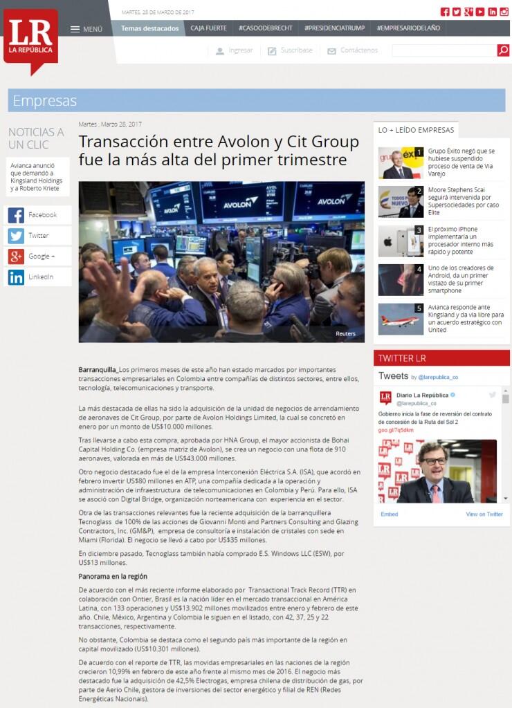 Transacción entre Avolon y Cit Group fue la más alta del primer trimestre