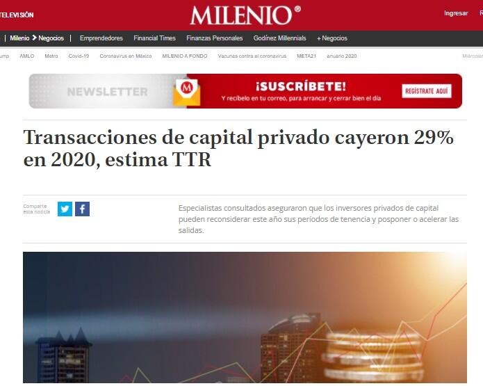 Durante 2020 las transacciones realizadas por fondos de capital privado en México sumaron alrededor de 17, por lo que se vieron reducidas en un 29 por ciento en el volumen y un 60 por ciento en el valor agregado por un monto de mil millones de dólares; sin embargo, la empresa TTR estima que para este año los gestores de fondos impulsarán la actividad de fusiones y adquisiciones.