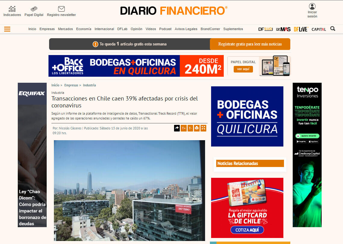 Hasta el 11 de junio de 2020, Chile ha registrado una disminución del 39% en el volumen de transacciones, mientras que el valor agregado de las operaciones anunciadas y cerradas ha caído un 67%, según datos del estudio.