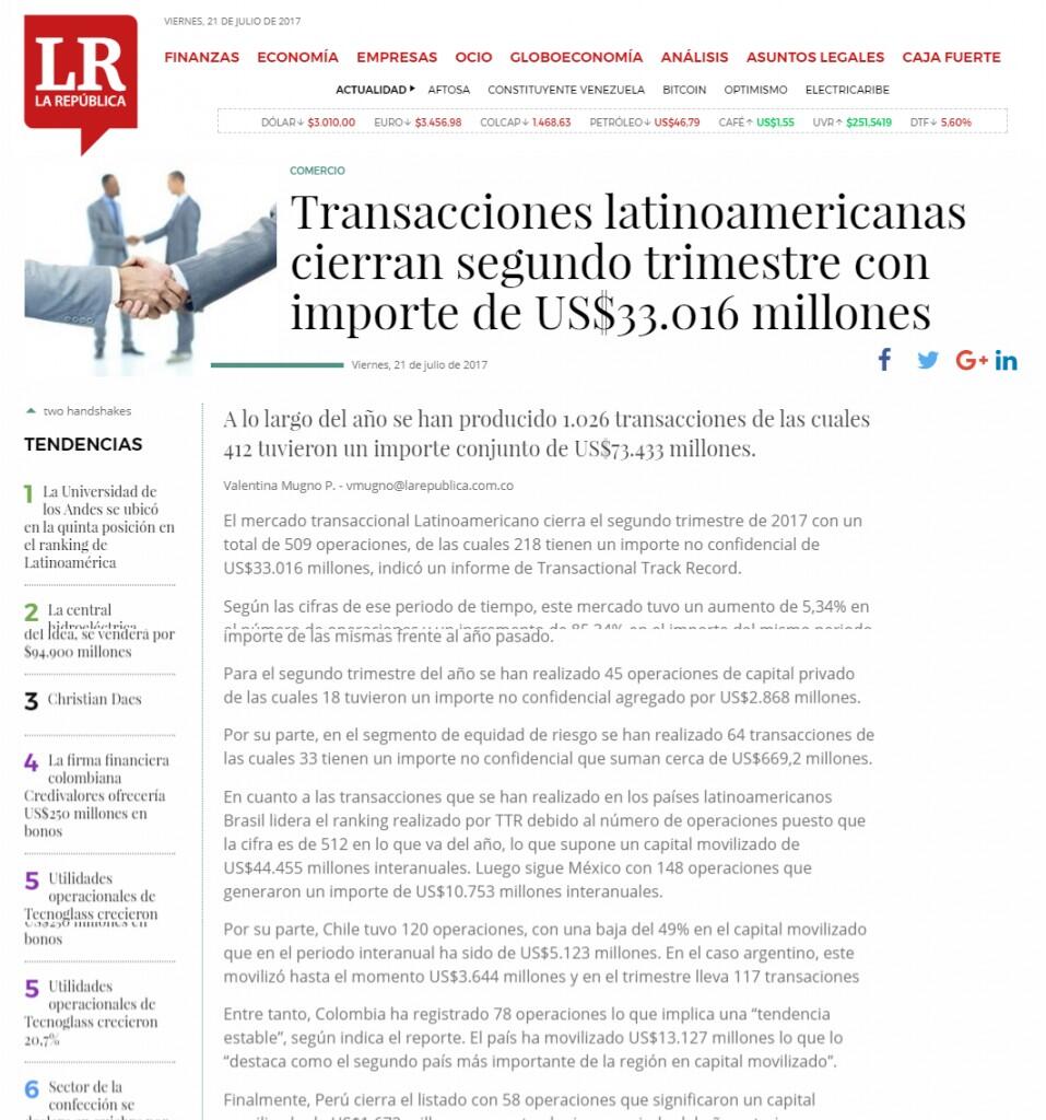 El mercado transaccional Latinoamericano cierra el segundo trimestre de 2017 con un total de 509 operaciones, de las cuales 218 tienen un importe no confidencial de US$33.016 millones, indicó un informe de Transactional Track Record.