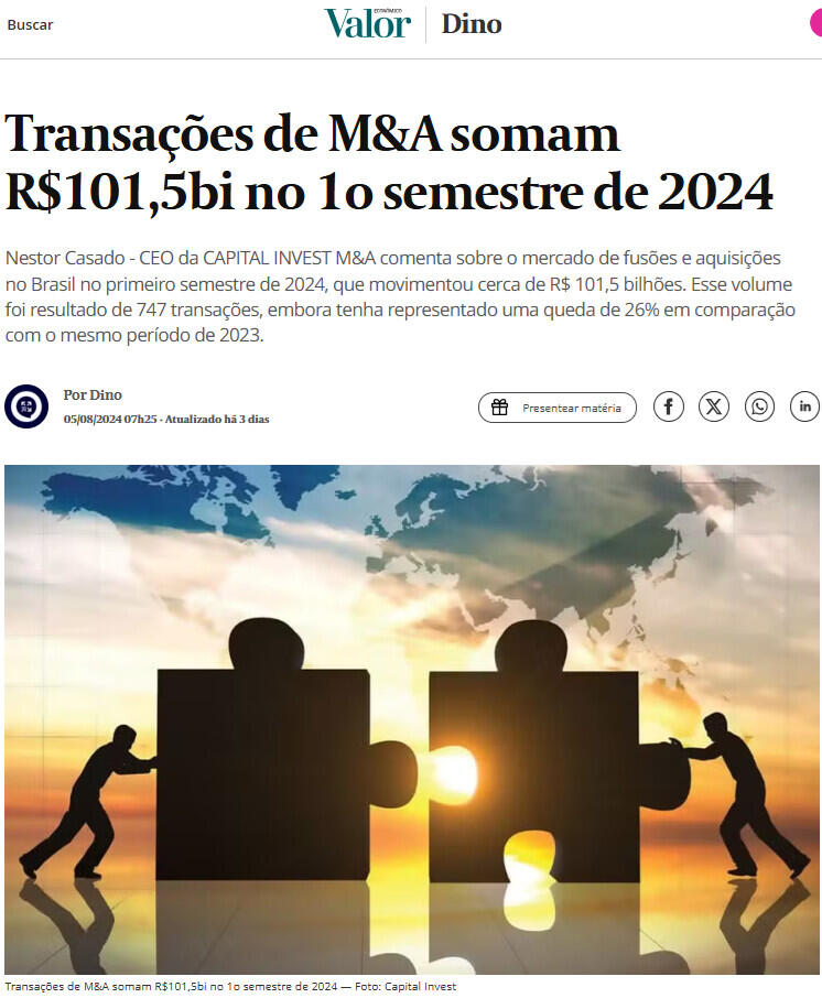 CEO da CAPITAL INVEST M&A comenta sobre o mercado de fusões e aquisições no Brasil no primeiro semestre de 2024, que movimentou cerca de R$ 101,5 bilhões. Esse volume foi resultado de 747 transações, embora tenha representado uma queda de 26% em comparação com o mesmo período de 2023.